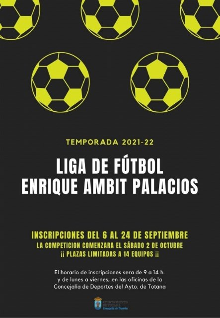 La Concejalía de Deportes convoca la Liga de Fútbol “Enrique Ambit Palacios” 2021/2022, que comenzará el sábado 2 de octubre, y se jugará sábados por la tarde y domingos por la mañana, preferentemente en los campos de césped artificial de la Ciudad Deportiva “Valverde Reina, y en el caso de que sea necesario en el campo de césped artifcial del Complejo Deportivo “Valle del Guadalentín” del Paretón.