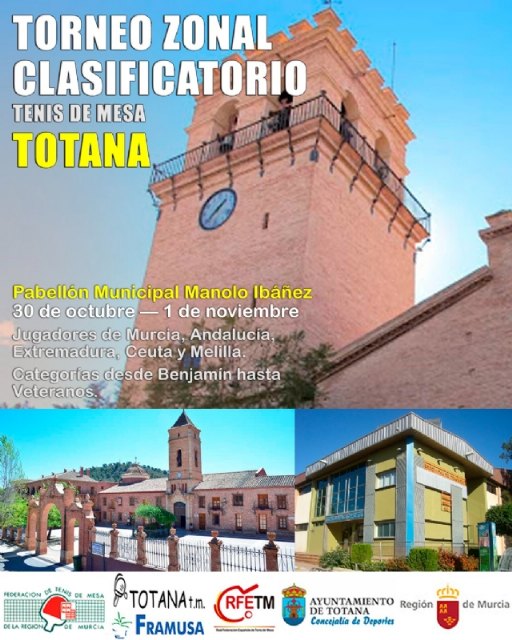 El Pabellón de Deportes “Manuel Ibáñez” de Totana acogerña el Torneo Zonal Clasificatorio de Tenis de Mesa, del 30 de octubre al 1 de noviembre; una prueba clasificatoria para los distintos Campeonatos de España que se celebra en 4 zonales en toda España.