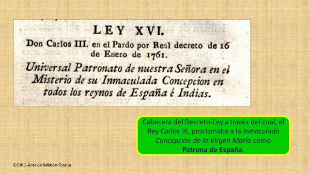 Estos Decretos Vaticanos, fueron recibidos en España con gran júbilo y gozo, tal y como se deduce del Decreto-Ley que el Rey Carlos III firmó el 16 de enero de 1761, por el que proclamaba Patrona de todos sus Reinos “a esta Señora en el misterio de su Inmaculada Concepción”.