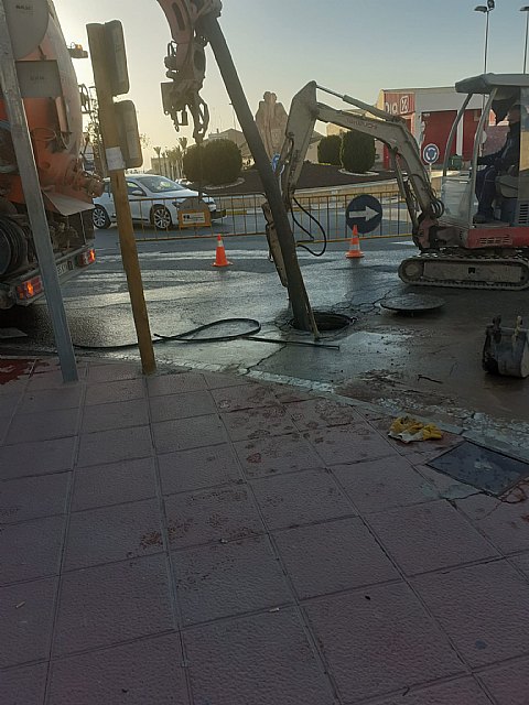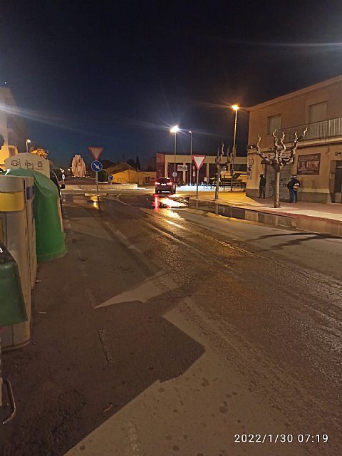 Tanto el servicio municipal de aguas como Protección Civil y Policía Local trabajan desde las 4 de la madrugada y en estos momentos para corregir el problema y evitar la continuada salida de agua. Esta mañana, dirigiéndome hacia la plaza a saludar a los participantes de la XVI Subida al Morrón de Espuña, veo el problema y llamo a Jesús para ver una solución: