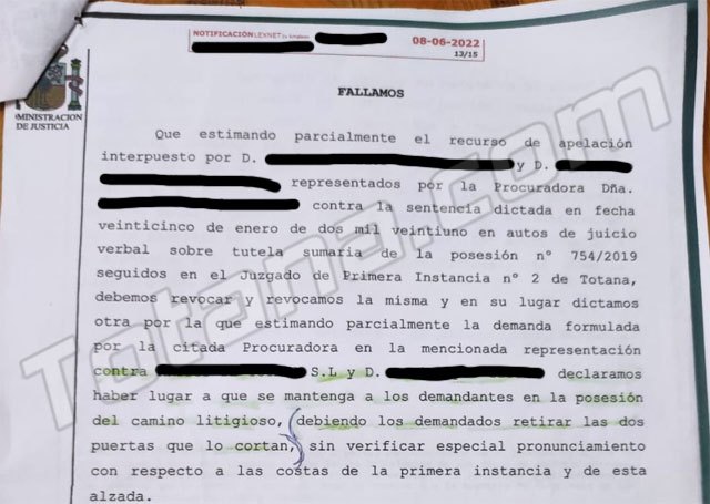 La resolución, a la que ha tenido acceso Totana.com, es firme y no cabe recurso ordinario alguno contra la misma, obligando a la parte demandada a retirar las puertas. Asimismo, la sentencia establece que los vecinos mantienen la posesión del mencionado camino litigioso.