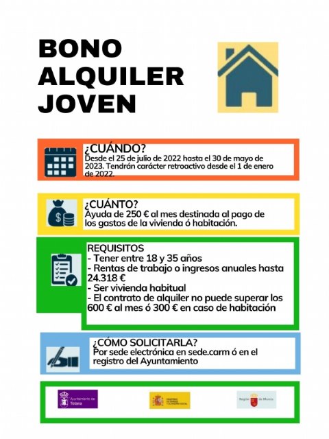 La Consejería de Fomento e Infraestructuras de la Región de Murcia comunica que, desde hoy, se encuentra abierta la convocatoria para acceder a las ayudas Bono Alquiler Joven y Bono Cultural Joven, enfocadas a la emancipación, y al disfrute y adquisición de productos culturales por parte de los jóvenes.