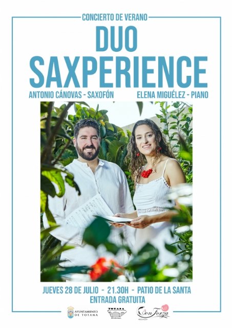 La Concejalía de Cultura comunica que el próximo jueves 28 de julio va a tener lugar un concierto interpretado por el dúo musical “Sax Experience”, conformado por Antonio Cánovas, al saxofón, y Elena Miguélez, al piano.