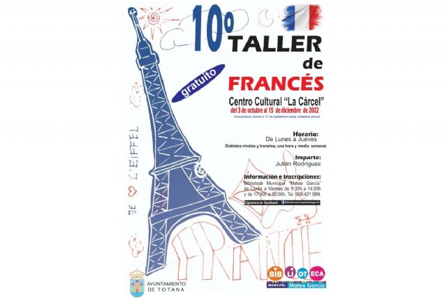 La Concejalía de Cultura informa que se van a retomar los talleres de conversación de francés impartidos por Julián Rodríguez, los cuales tendrán lugar desde el 3 de octubre hasta el 15 de diciembre.
