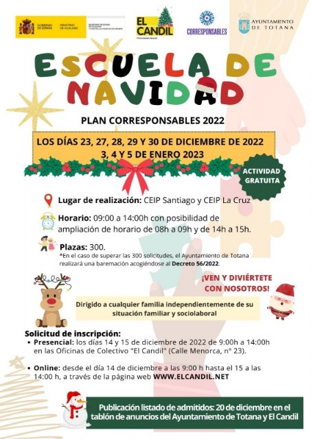 La Concejalía de Juventud comunica que desde hoy y hasta mañana se encuentra abierto el plazo de inscripción para participar en la Escuela de Navidad 2022, que tendrá lugar durante los días laborables de las semanas de Navidad y Reyes (27, 28, 29 y 30 de diciembre, y 3, 4 y 5 de enero).