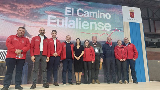 El alcalde de Totana, Pedro José Sánchez, y el presidente de la Fundación La Santa y párroco de la Parroquia de Santiago El Mayor de Totana, Francisco José Fernández, han presentado durante la mañana de hoy el proyecto cultural, turístico y religioso Camino Eulaliense “Totana-Mérida” en la Feria Internacional de Turismo, Fitur.