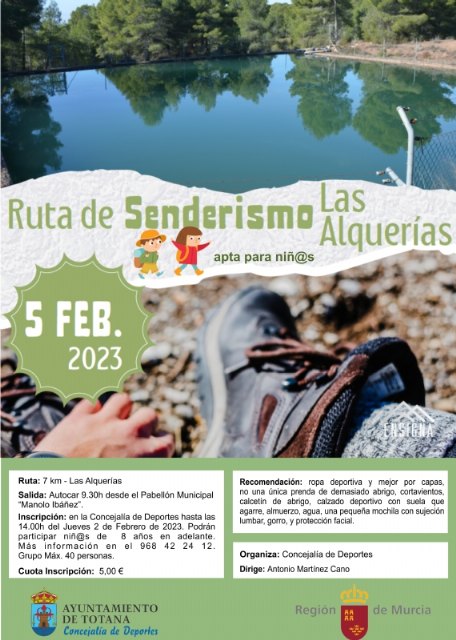 Las inscripciones tienen un coste de 5 euros por participante e incluye traslado en autocar y seguro de accidentes, se deben de formalizar en la Concejalía de Deportes hasta el jueves 2 de febrero, de lunes a viernes, en horario de 9:00 a 14:00 horas. Más información en el teléfono 968 42 24 12 y en el email: cmunuera@totana.es