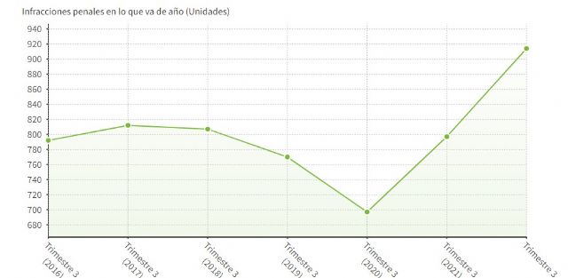 • Actualmente se comenten más delitos que nunca. El último periodo analizado por el Ministerio del Interior señala que en el municipio se cometen 24 delitos cada semana. Se han registrado 4 agresiones sexuales, un homicidio, 65 delitos de lesiones, 34 robos con violencia, 48 robos con fuerza en domicilios y 154 hurtos, entre otros.
