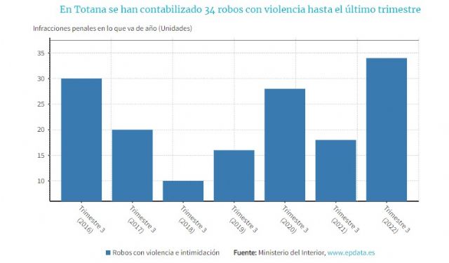 Las cifras de delincuencia que reflejan el grado de inseguridad ciudadana en el municipio de Totana encadenan un nuevo y preocupante empeoramiento en la práctica totalidad de hechos denunciados. La comisión de delitos, que ya se incrementó durante el primer y segundo trimestre del año, lo ha vuelto a hacer nuevamente en el tercero. Así, en el periodo comprendido entre enero y septiembre, el número de hechos criminales se ha incrementado un 14,7%, un dato que confirma que la gestión en materia de seguridad no está a la altura de las circunstancias y Totana necesita un cambio para adaptar sus recursos en esta materia a la realidad que viven los vecinos del municipio. Estamos ante números que constatan una realidad y que tienen que abrir una profunda reflexión tanto dentro de quienes gestionan nuestro ayuntamiento, como en los responsables de la Delegación del Gobierno.