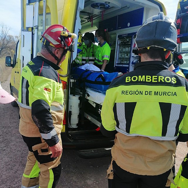 Tras ser rescatado por los bomberos, el accidentado (varón, de unos 40 años de edad) ha sido estabilizado por los sanitarios y trasladado al hospital "Rafael Méndez", de Lorca.