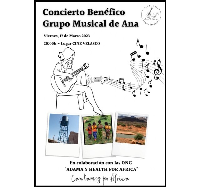 Las ONG´s “Adama” y “Health for Africa” organizan este viernes, día 17 de marzo, un concierto benéfico del Grupo Musical de Ana, que tendrá lugar en el Cinema Velasco, a partir de las 20:00 horas, cuya recaudación irá destinada íntegramente a la construcción de un pozo de agua en una zona rural.