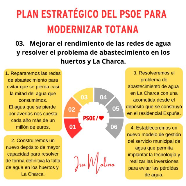 Isa Molino asegura que solo el 56% del agua para consumo humano que el Ayuntamiento de Totana le compra a la Mancomunidad de Canales del Taibilla llega a los hogares, el resto, casi la mitad, se pierde por el mal estado de la red de distribución. Según la candidata, esto le supone al ayuntamiento un gasto de más de un millón de euros en agua que no se aprovecha.