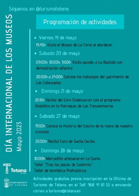 Todas las actividades necesitan la inscripción previa de los interesados a través de la Oficina de Turismo, en el teléfono 968 418153 o el correo electrónico turismo@totana.es