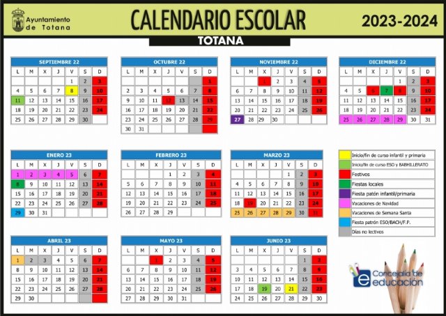 El curso escolar 2023/24 en el municipio de Totana comenzará en Educación Infantil y Primaria el próximo 8 de septiembre; y en la Educación Secundaria Obligatoria (ESO) y Bachillerato el 11 del mismo mes, según informan fuentes de la Concejalía de Educación.