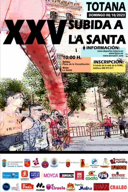 La Concejalía de Deportes informa que ya está abierta la inscripción para participar en la XXV Subida a La Santa que organiza este departamento municipal con la colaboración de la Federación de Atletismo de la Región de Murcia (FAMU); una prueba enmarcada en el circuito de Carreras Populares de la Región de Murcia "Running Challenge 2023” y que se celebrará el domingo 08 de octubre, con salida en la plaza de la Constitución (10:00 horas) y meta en el Santuario de la Santa.