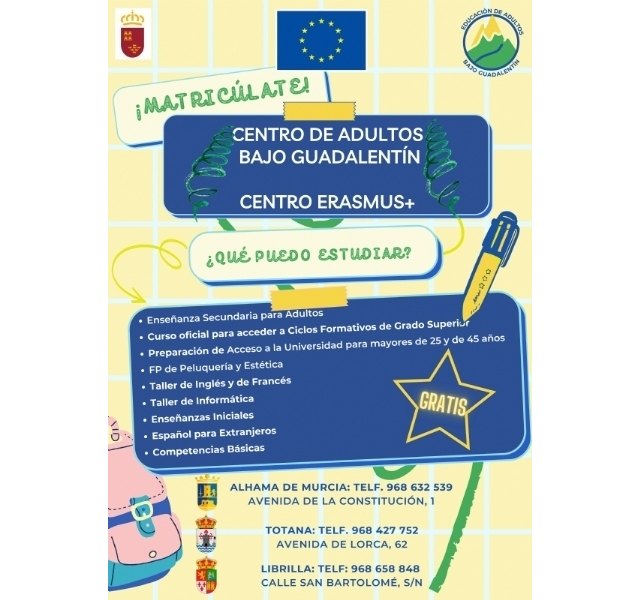 La Concejalía de Educación recuerda la oferta formativa del Centro de Adultos Bajo Guadalentín para el curso 2023/2024 para todas las enseñanzas y cursos gratuitos del centro que da cobertura a Alhama, Librilla y Totana, una oportunidad para retomar los estudios y ampliar conocimientos a partir de la mayoría de edad.