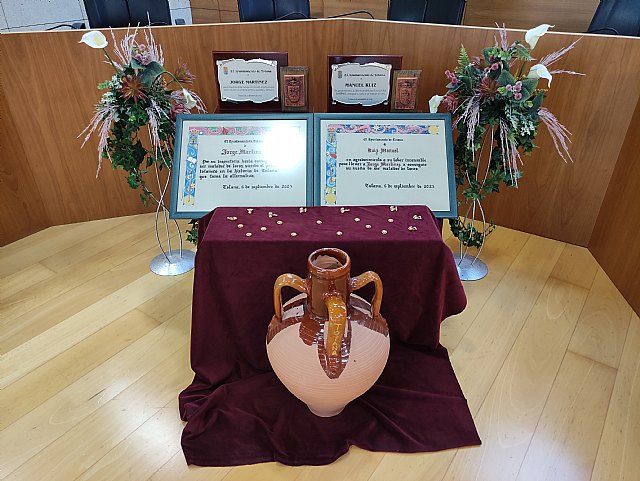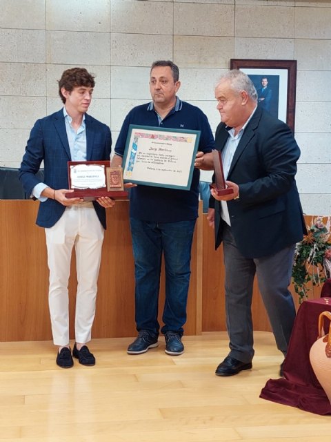 El alcalde, Juan Pagán, y el presidente de la Peña Cultural Taurina, Francisco Javier Tudela, hicieron entrega de sendos pergaminos y placas conmemorativas al torero totanero y a su apoderado, Manuel Ruiz.