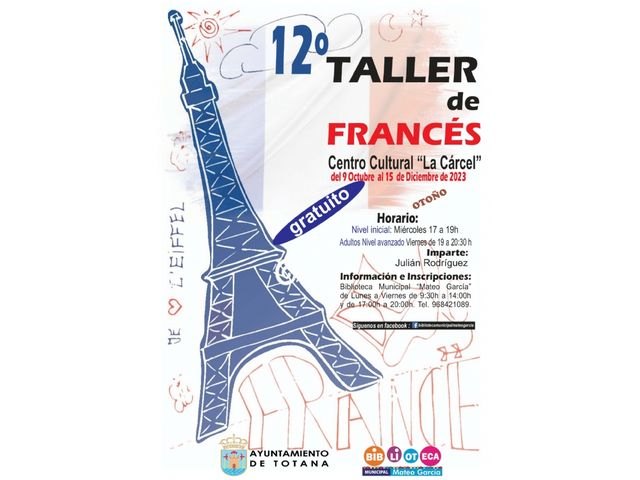 La Concejalía de Cultura informa de la puesta en marcha del 12º Taller de Conversación en Francés que se llevará a cabo del 9 de octubre al 15 de diciembre de este año en el Centro Sociocultural "La Cárcel".