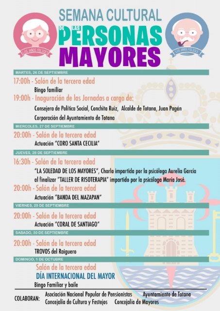 El Centro Municipal de Personas Mayores de la plaza Balsa Vieja acoge a partir del próximo martes la Semana Cultural de las Personas Mayores, organizadas por la Asociación Nacional Popular de Pensionistas, con la colaboración de las concejalías de Mayores y de Cultura y Festejos del Ayuntamiento de Totana.