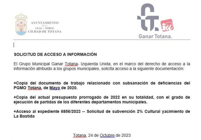 Por último, Ganar Totana solicitó acceso al expediente que contiene el proyecto presentado para las subvenciones del "2% cultural". Esta petición se hizo tras la falta de respuestas claras a preguntas planteadas en el último pleno sobre este asunto.