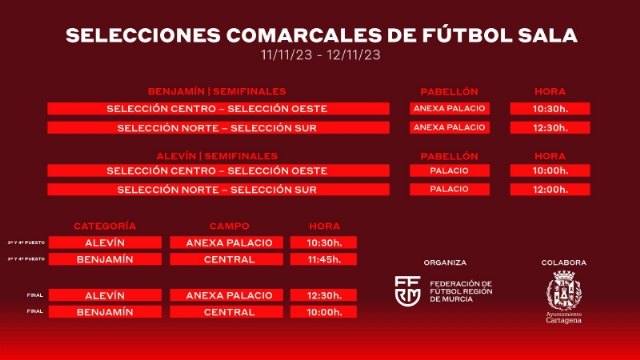 Las eliminatorias  de la categoría benjamín se celebrarán el sábado por la mañana en el Pabellón Anexo al Palacio de los Deportes de Cartagena, a las 10:30 horas y a las 12:30 horas, respectivamente; y los encuentros de semifinal de la categoría alevín se desarrollarán en el Palacio de Deportes, a las 10.00 horas y a las 12.00 horas.
