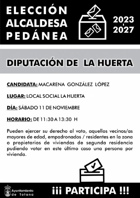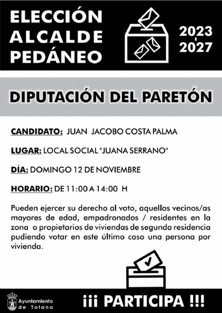 La Concejalía de Participación Ciudadana comienza este próximo fin de semana las jornadas de elecciones o ratificaciones  de alcaldes pedáneos para esta legislatura 2023/2027, con la celebración en las pedanías de La Huerta, Lébor y El Paretón.