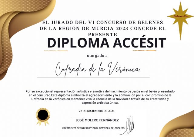 El Belén de la Verónica obtiene un Diploma Accésit del concurso regional de belenes en la categoría de asociaciones y peñas huertanas, un testimonio del aprecio del jurado y la comunidad por la presentación cuidadosa y conmovedora de su belén La creatividad y el mensaje espiritual transmitido han dejado una huella única, iluminando los corazones de nuestra comunidad durante la celebración navideña