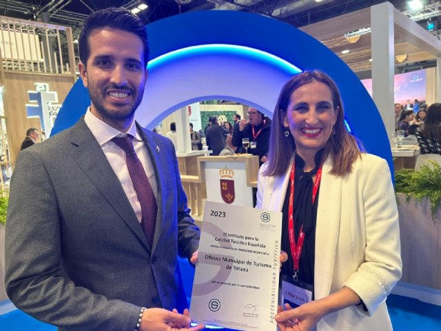 El director general de Calidad Turística, Patricio Sánchez, hizo entrega el pasado viernes del diploma Mención Especial a la Oficina Municipal de Turismo de Totana por su apuesta por la sostenibilidad y calidad turística en el transcurso de la Feria Internacional de Turismo (FITUR) en Madrid. Ha recibido el galardón la concejal de Turismo, Cultura y Yacimientos Arqueológicos, Maribel Rubio de la Peña, en representación del Ayuntamiento de Totana.
