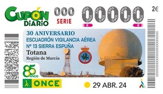 El 30 aniversario del Escuadrón de Vigilancia Aérea nº 13 Sierra Espuña es el motivo del cupón de la ONCE del lunes, 29 de abril, en cuyo sorteo saldrán a la venta cinco millones de cupones difundirán la imagen de este escuadrón, con sede en Totana, cuyo lema es ‘Nos la jugamos’.