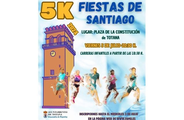 La Concejalía de Deportes abre las inscripciones para la Carrera Popular 5K Fiestas de Santiago, que se celebrará el próximo 5 de julio, organizada por la Concejalía de Deportes Totana.