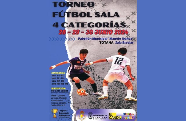 La Concejalía de Deportes, en colaboración con el Colectivo El Candil y la Asociación de Árbitros de Totana, organiza dentro del programa de ocio infantil y juvenil, un torneo de fútbol sala dirigido a las categorías alevín, infantil, cadete y juvenil, que se celebrará en el Pabellón Municipal “Manolo Ibáñez” y en la Sala Escolar los próximos días 28, 29 y 30 de junio.