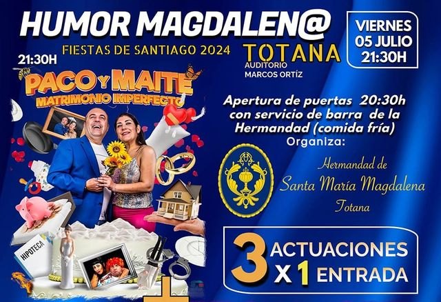 El espectáculo organizado por la Hermandad de Santa María Magdalena de Totana, Humor Magdalen@, será solidario con la Asociación de Enfermedades Raras D´Genes. Tendrá lugar el próximo 5 de julio a partir de las 21:30 horas en el Auditorio Marcos Ortiz de Totana, en el marco de las fiestas patronales de Santiago.