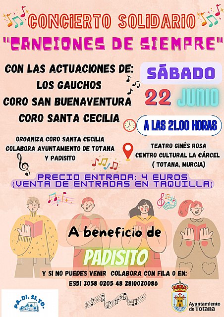 El Coro Santa Cecilia, Los Gauchos y el Coro San Buenaventura participarán en el Concierto Solidario "Canciones de Siempre" el 22 de junio, en el Teatro Ginés Rosa, a partir de las 21:00 horas, a beneficio de la Asociación PADISITO.