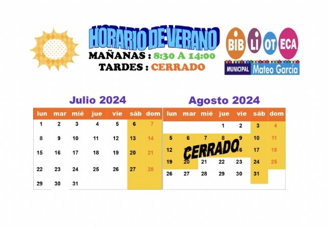 Por su parte, Biblioteca Municipal “Mateo García” estará abierta este verano por las mañanas, de 8:30 a 14:00 horas; cerrando solamente del 5 al 20 de agosto.