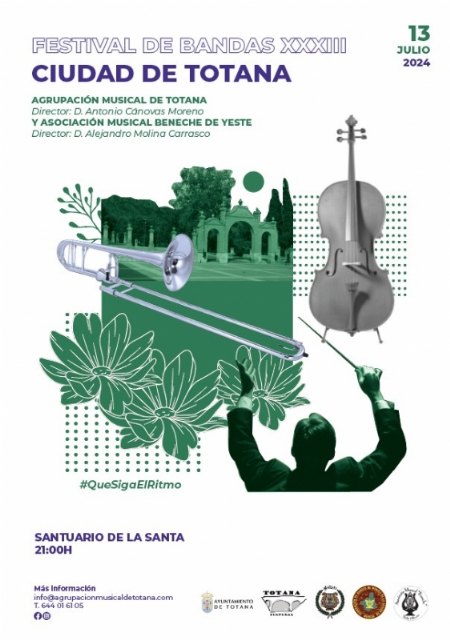 El XXXIII Festival de Bandas “Ciudad de Totana” acogerá la convivencia y actuación conjunta de la Agrupación Musical local y la Asociación Musical “Beneche” de Yeste (Albacete), el 13 de julio, a patir de las 21:00 horas, en la explanada existente en el Santuario de La Santa junto al aparcamiento de vehículos.