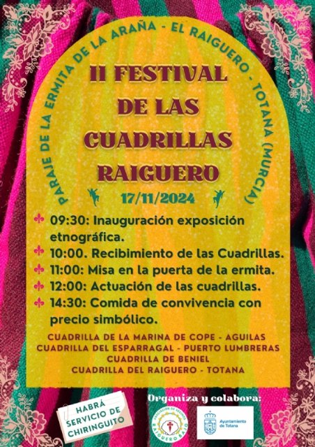 El II Festival de las Cuadrillas del Raiguero se celebra en el paraje de la ermita de la Araña el domingo 17 de noviembre, organizado por la Asociación del Raiguero Bajo en virtud del convenio de colaboración para la promoción y dinamización social con la Concejalía de Pedanías y Participación Ciudadana.