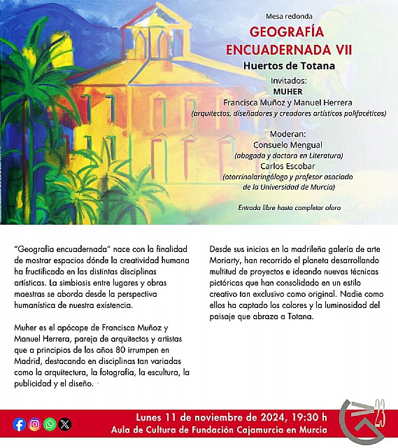 Los artistas Francisca Muñoz y Manuel Herrera, más conocidos como MUHER, participarán el próximo lunes, 11 de noviembre, a las 19:30 horas, en el 'VII Ciclo Geografía encuadernada', que se celebrará en el Aula de Cultura de la Fundación Cajamurcia en Murcia (Gran Vía, 23). En la charla-diálogo conversarán con Consuelo Mengual, abogada y doctora en Literatura por la Universidad de Murcia, y Carlos Escobar, otorrinolaringólogo, profesor asociado en la Universidad de Murcia y coordinador del ciclo. Con entrada libre hasta completar aforo, el acto también se podrá seguir en directo o ver en diferido en el cantal de YouTube de la Fundación Cajamurcia.