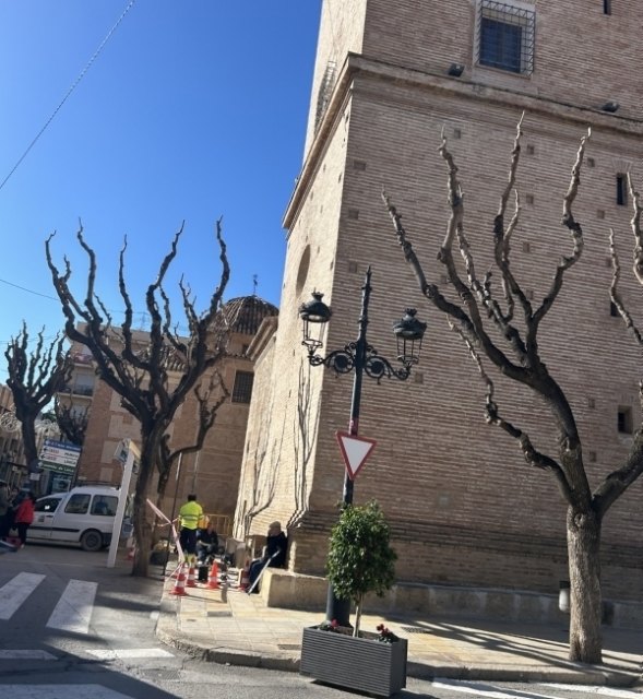 Los nuevos focos se están instalando en la acera que circunda la parada de taxis, junto a la sacristía del templo parroquial.