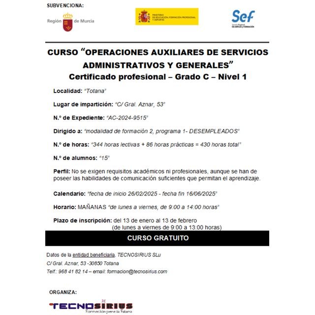 Tecnosirius organiza un curso gratuito de servicios administrativos en Totana