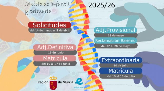 El 14 de marzo arrancará el proceso de admisión de alumnos para el próximo curso escolar 2025/2026 y lo hará el mismo día para todos los ciclos de Infantil, Primaria, Secundaria y Bachillerato, según ha comunicado al Ayuntamiento de Totana la Consejería de Educación y Formación Profesional de la Región de Murcia.