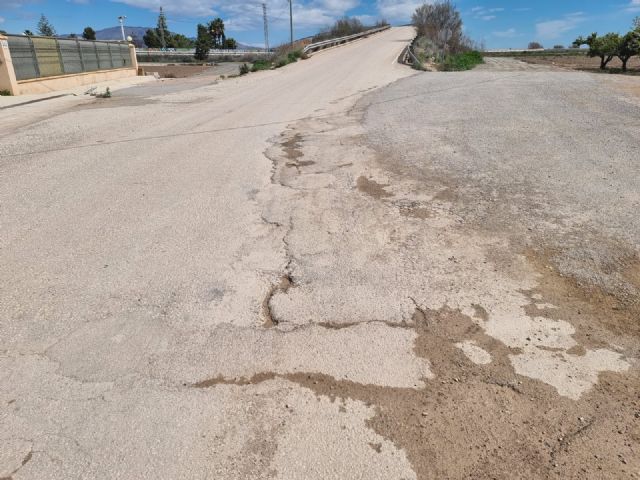 Los vecinos de La Ñorica se enfrentan a un deterioro continuado del camino que conecta la Carretera de Mazarrón (RM 315) a su paso por el Río Guadalentín con la Vía Nueva, marcado por numerosos socavones que obligan a los conductores a abandonar en varios tramos el firme para poder circular.