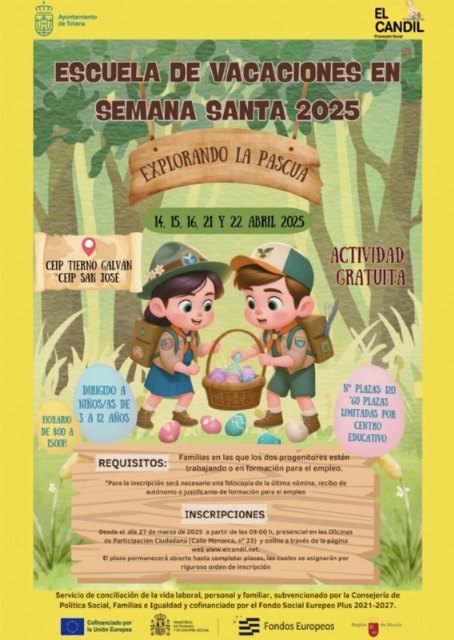 La Escuela de Vacaciones de Semana Santa "Explorando la Pascua", un servicio de conciliación laboral y familiar que organiza la Concejalía de Juventud y gestiona el Colectivo para la Promoción Social "El Candil", abre su plazo de inscripción el próximo jueves 27 de marzo.