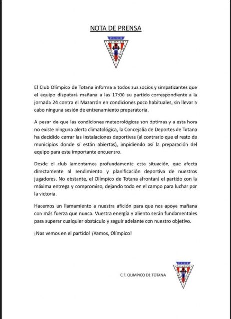 El Club Olímpico de Totana ha informado que su equipo afrontará el partido de mañana contra el Mazarrón en condiciones poco habituales, ya que no ha podido realizar ninguna sesión de entrenamiento preparatoria.
