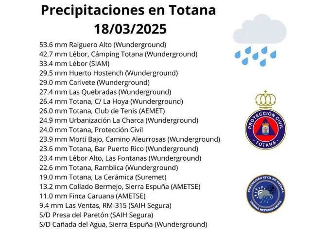 En general, agua muy bien caída, con acumulados de entre 10 y 50 mm, siendo Raiguero Alto el lugar con más precipitación registrada. En el núcleo urbano han caído entre 20 y 25 mm.