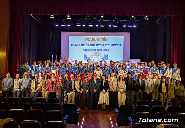 El pasado jueves 8 de mayo celebramos la ceremonia de Graduación de nuestro alumnado de Grado Medio y Grado Superior, en el Teatro del Centro Sociocultural de La Cárcel. Tras la interpretación musical del artista Moica, se dio paso a las intervenciones del Jefe de Estudios de Formación Profesional, D. Alejandro García Pérez, de la Directora del Instituto, Dª. Ana Dougnac Pascual, del Director General de Formación Profesional, Enseñanzas de Régimen Especial y Educación Permanente, D. Luis Quiñonero Ruiz y de la Concejala de Educación, Cultura y Turismo del Ayuntamiento de Totana, Dª. Mª Isabel Rubio de la Peña, que nos acompañaron en esta ceremonia que marca la culminación de la etapa académica de nuestros estudiantes en Formación Profesional.