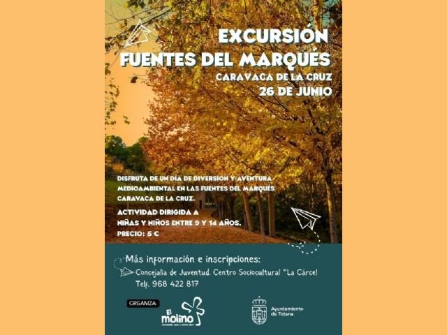 La Concejalía de Juventud, junto al l Molino Formación, Ocio y Tiempo Libre, ha organizado una excursión a las Fuentes del Marqués, en Caravaca de la Cruz, el próximo 26 de junio, para niños de 9 a 14 años, organizado dentro del programa del “Verano Joven 2025”.