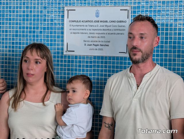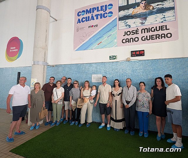 El Ayuntamiento de Totana ha rendido un homenaje póstumo a José Miguel Cano Guerao, conocido cariñosamente como "el Cano", con el nombramiento oficial del complejo acuático cubierto del Centro Deportivo MOVE con su nombre. El acto, que tuvo lugar el pasado sábado 14 de junio y que contó con una nutrida representación institucional y ciudadana, dio cumplimiento al acuerdo plenario aprobado por unanimidad por todos los partidos políticos en el Pleno del mes de marzo de 2025.