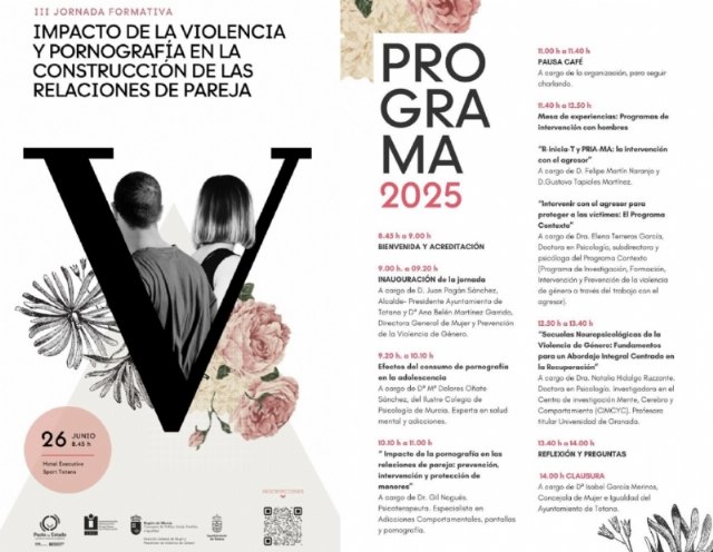 La Concejalía de Igualdad y el Centro de Atención Especializada para Mujeres Víctimas de Violencia (CAVI) de Totana organizan el próximo 26 de junio, en el Hotel Executive Sport, la III Jornada Formativa titulada “Impacto de la violencia y la pornografía en la construcción e las relaciones de pareja”.