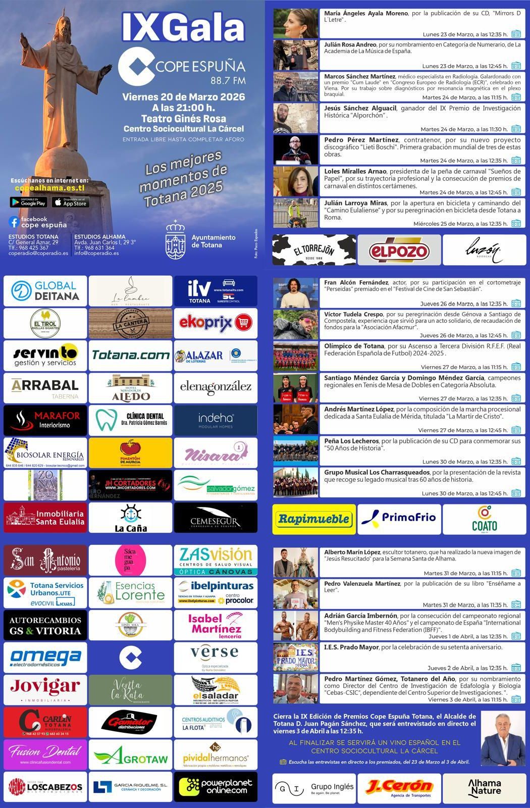 Como complemento a la gala, COPE Espuña emitirá una programación especial con entrevistas en directo a los premiados entre el 23 de marzo y el 3 de abril. La programación culminará el viernes 3 de abril, con una entrevista al alcalde de Totana, Juan Pagán Sánchez, que servirá como cierre de esta novena edición de los premios.