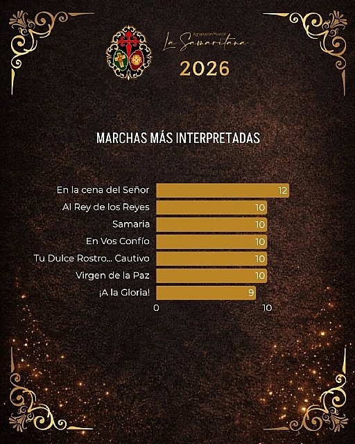 Entre las marchas más interpretadas en 2026 sobresale “En la cena del Señor”, con 12 interpretaciones, seguida por varias piezas con 10 interpretaciones como “Al Rey de los Reyes”, “Samaria”, “En Vos Confío”, “Tu Dulce Rostro… Cautivo” y “Virgen de la Paz”.